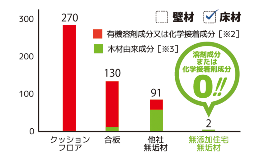 - ※2 溶剤成分または化学接着剤成分の多くは、石油由来の人工的な物質のことです。中には、厚生労働省が特に有害物質だと指定している物質も含まれます。