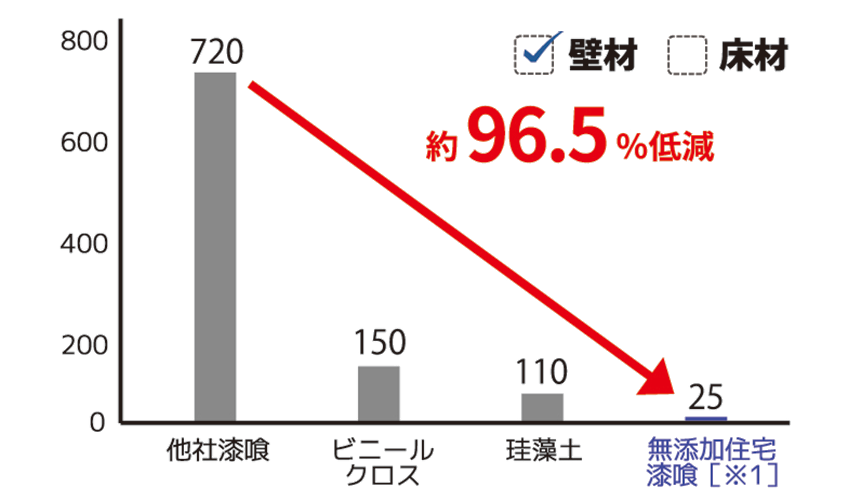 - ※1 木材由来成分とは、自然界にも存在し、食品添加物にも使用されている安全な物質のことです。実際に、食品に使用される香料やサラダ油に含まれる成分(ベンズアルデヒド、ヘキサナール、ノナナール、プロピオン酸、αーキューブネ、αーピネン、リモネン、αーカジネン、脂肪族炭化水素等)が検出されました。脂肪族炭化水素に関しては、漆喰施工時に使用するサラダ油由来のものと考えています。